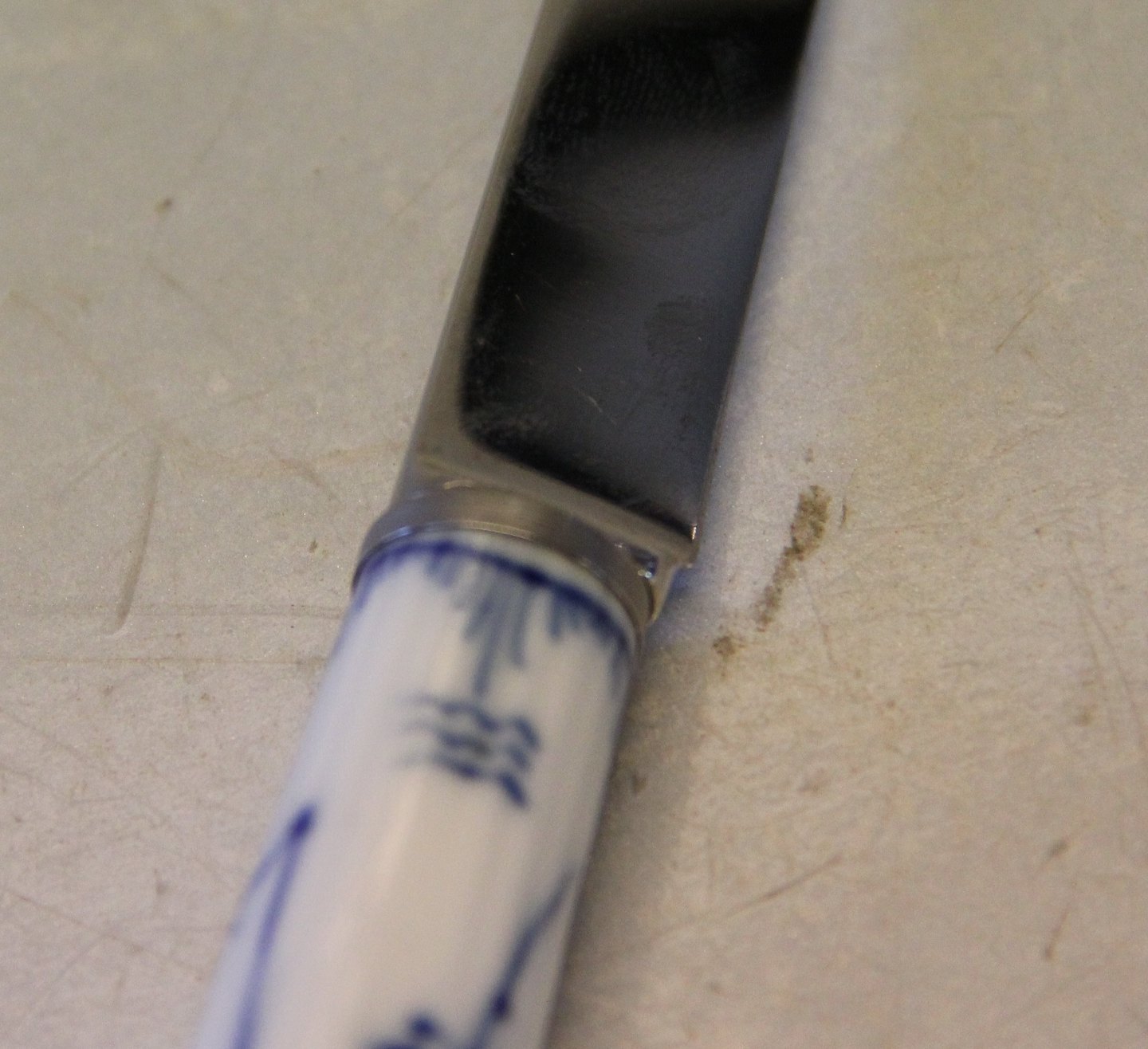 Musselmalet Ostekniv 19 cm Blad af rustfrit stål og porcelænsskaft Kongelig Dansk Porcelæn Musselmalet
