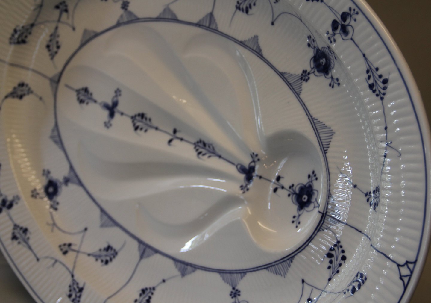 114-1 Fiskefad, ovalt med blæksprutte i relief 54 x 40 cm før 1923 Royal Copenhagen Musselmalet riflet . 2. sort. Muselmalet I fin stand - lille afslag på undersiden . Passer godt sammen med andre blåmalede spise- og kaffestel