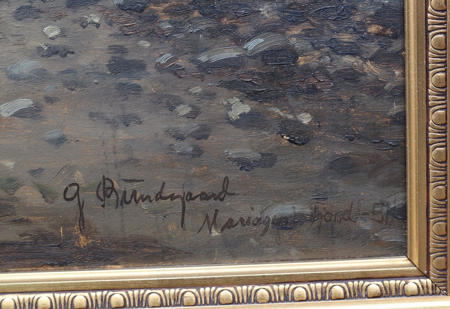 Beskrivelse: Færgehagen ved Mariagerfjord 1952 Stort Maleri af Gunnar Bundgaard 112 x 153 Cm med Guldramme
