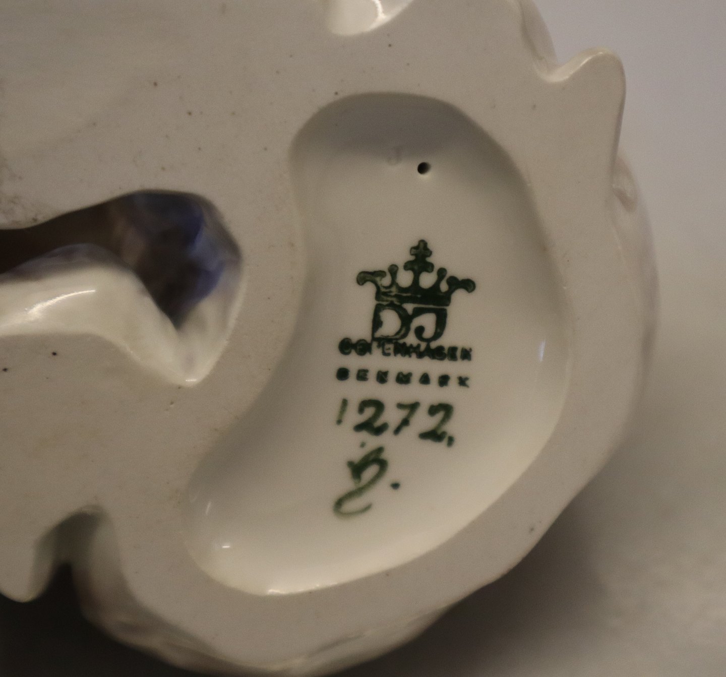 Beskrivelse: Dahl Jensen 1272 Isbjørn med fisk (LJ) 18 cm. Torsk Mærket med kongelig krone og DJ Copenhagen i hel og fin stand.