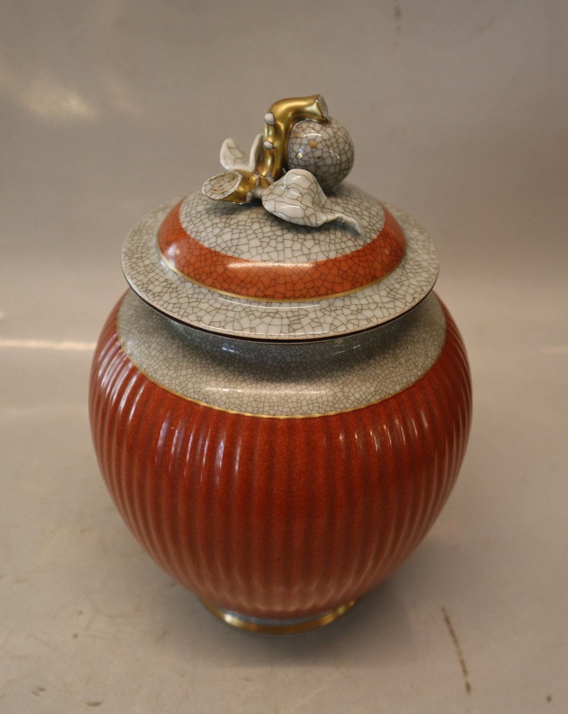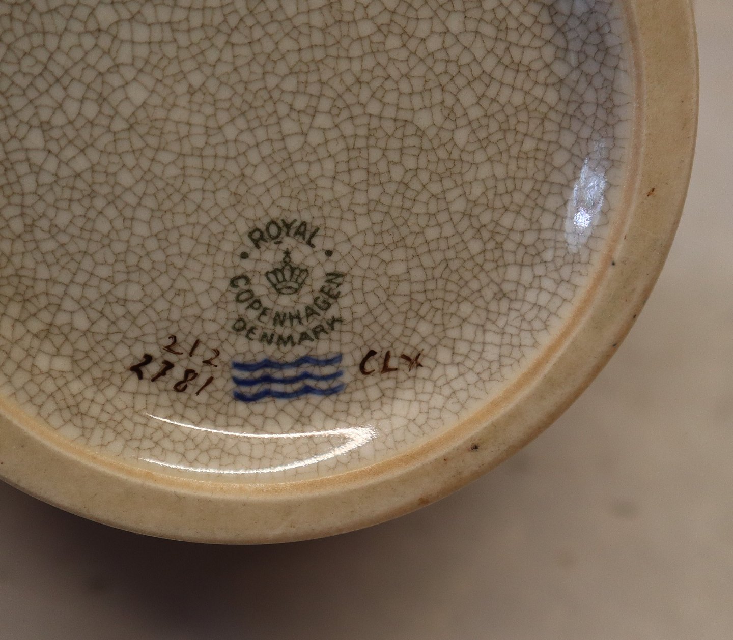 Beskrivelse: 212-2781 Kgl. Lågkrukke med gråt, orange og guld 25 cm Lågvase Craquelé fra Royal Copenhagen I hel og fin stand Urne