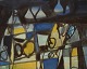 Poul Ekelund (1921-1976), Danmark. Olie på lærred. Modernistisk landskab med gule huse. Dateret 1965. |