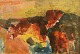 Gotthard Sandberg (1890-1961), svensk kunstner, olie på plade. Modernistisk landskab med heste på eng. |