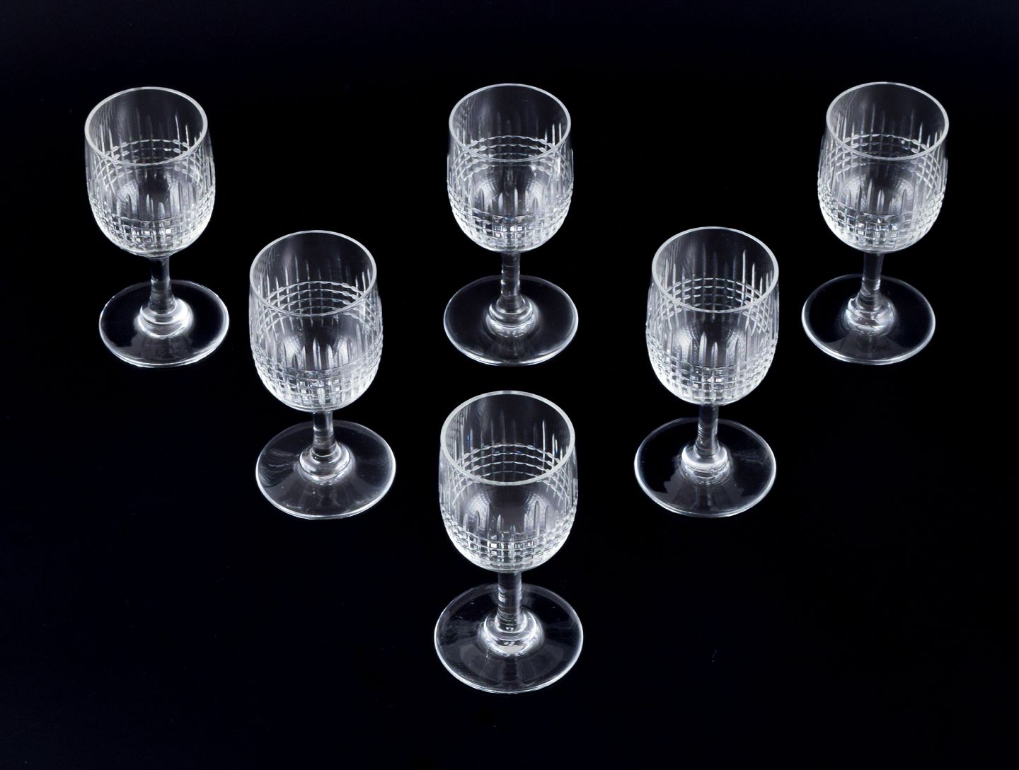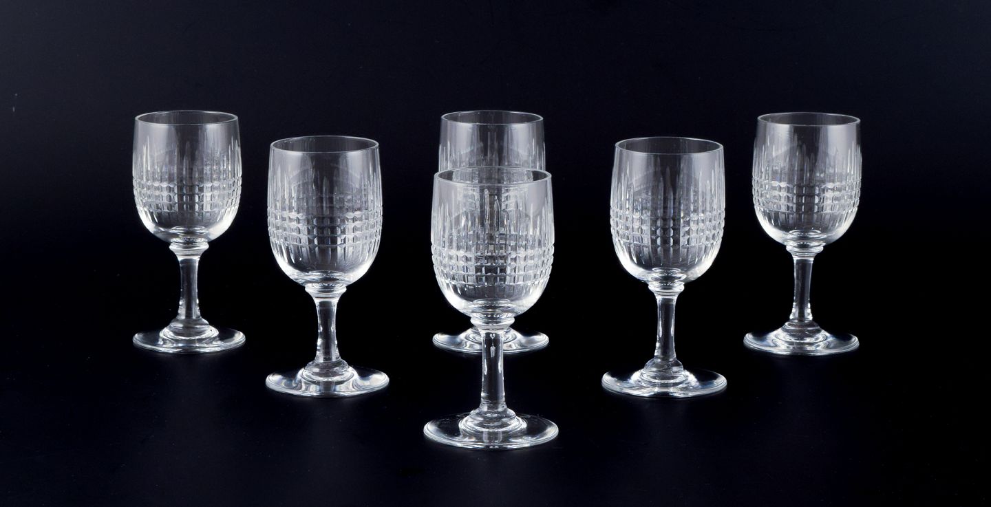 Baccarat, France. A set of six "Nancy" white wine glasses in clear crystal glass.