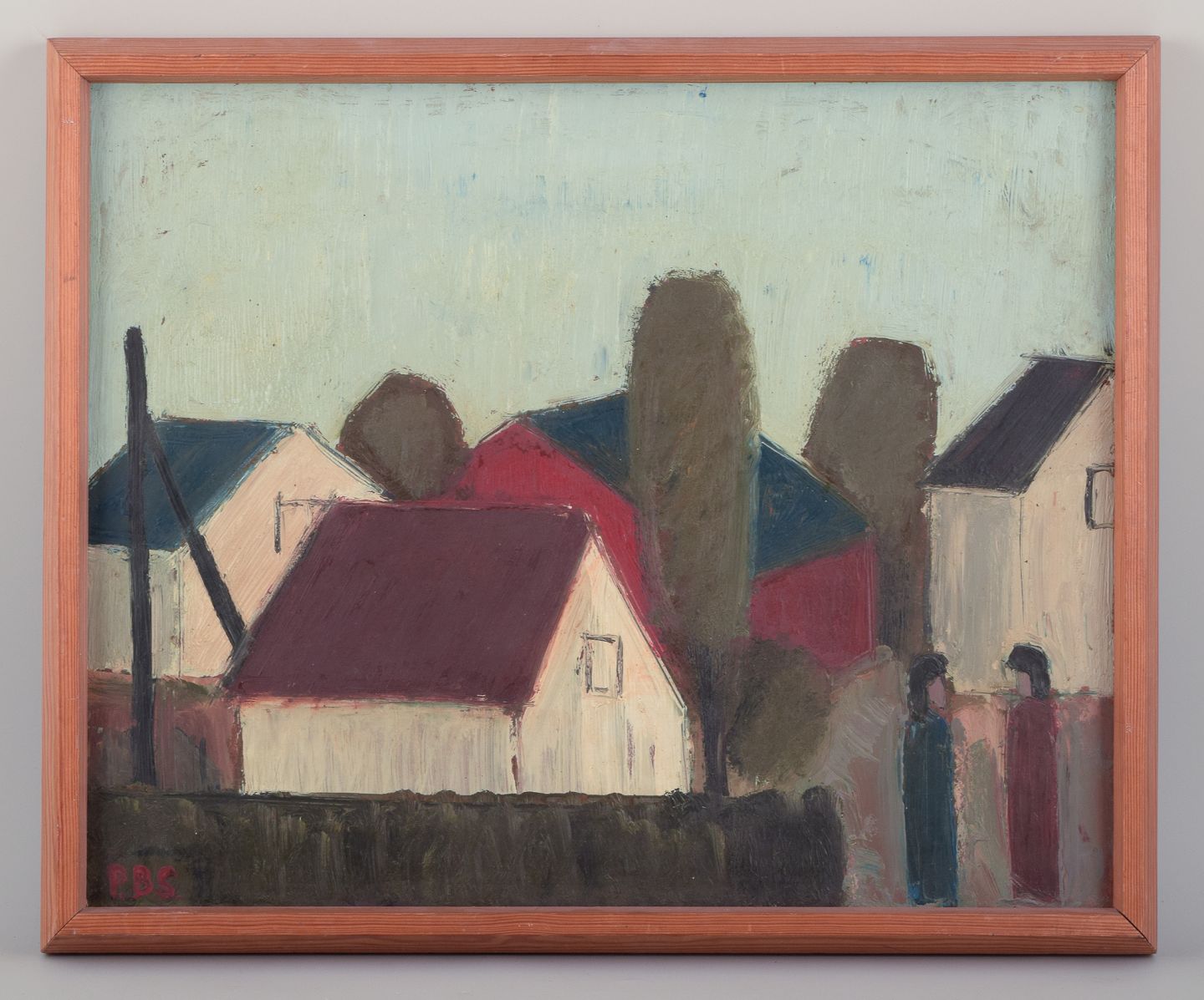 Peder Brøndum Sørensen (1931-2003), Danish painter, oil on canvas. Modernist cityscape. 1970s. Signed PBS. In perfect condition. Dimensions: 50 cm x 40 cm. Total with frame: 54.5 cm x 44.5 cm.