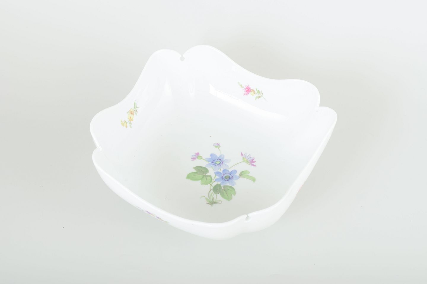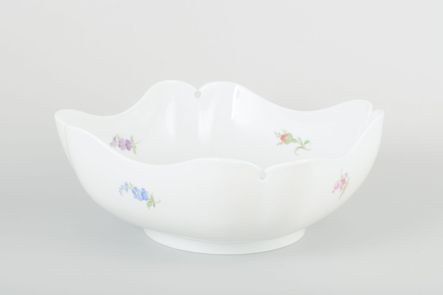 Elegant porcelain bowl with a scalloped rim and hand-painted multicoloured floral decorations. Classic Meissen design with soft contours and refined detailing.