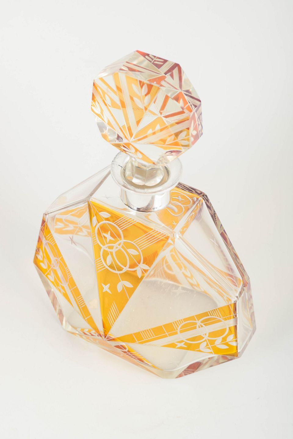 Facetted Art Deco decanter in cut and decorated crystal with orange/gold-toned crystal glaze and geometric ornamentation. Original facetted stopper and silver mount.