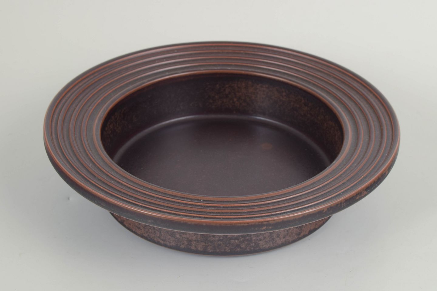 Large stoneware bowl from the Ruska series by Arabia, finished in the distinctive mottled dark brown glaze in warm earth tones. Open round form with a wide, profiled rim and deep well, suitable for serving. Natural glaze variations give the bowl an individual character.