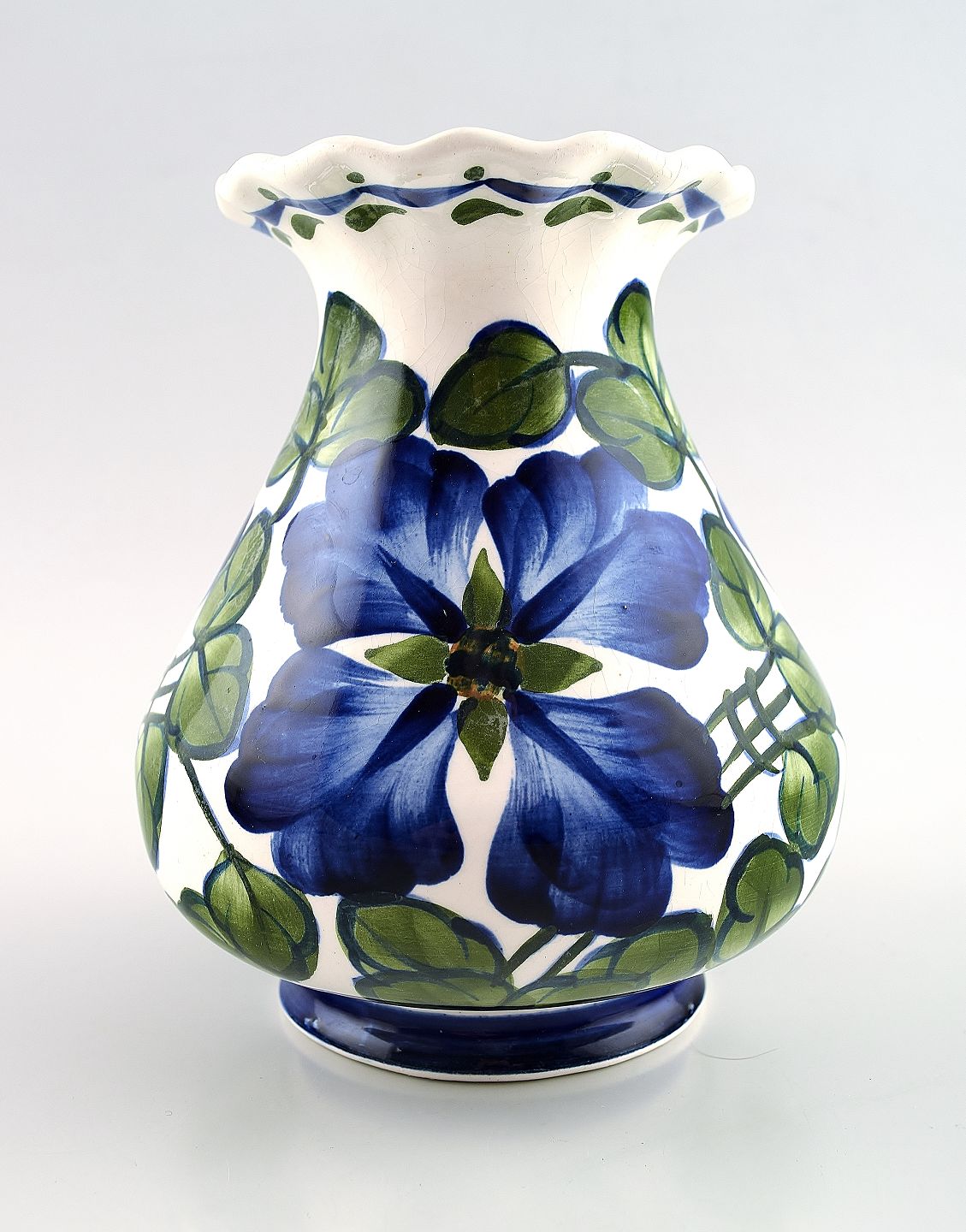 Aluminia fajance vase, håndmalet med blomster motiver. Måler 14 x 12 cm. I god stand. Stemplet. Ca. 1920.