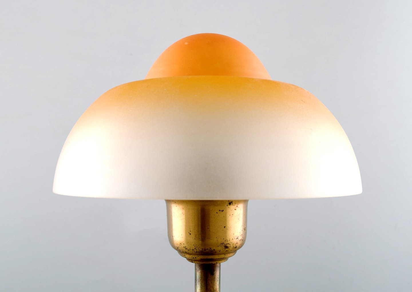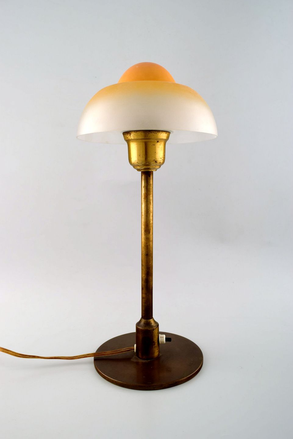 Fog & Mørup : Bordlampe med stamme af bruneret messing, monteret med "Spejlæg" skærme af glas. Højde 40 cm. Bredde 14 cm. I perfekt stand.