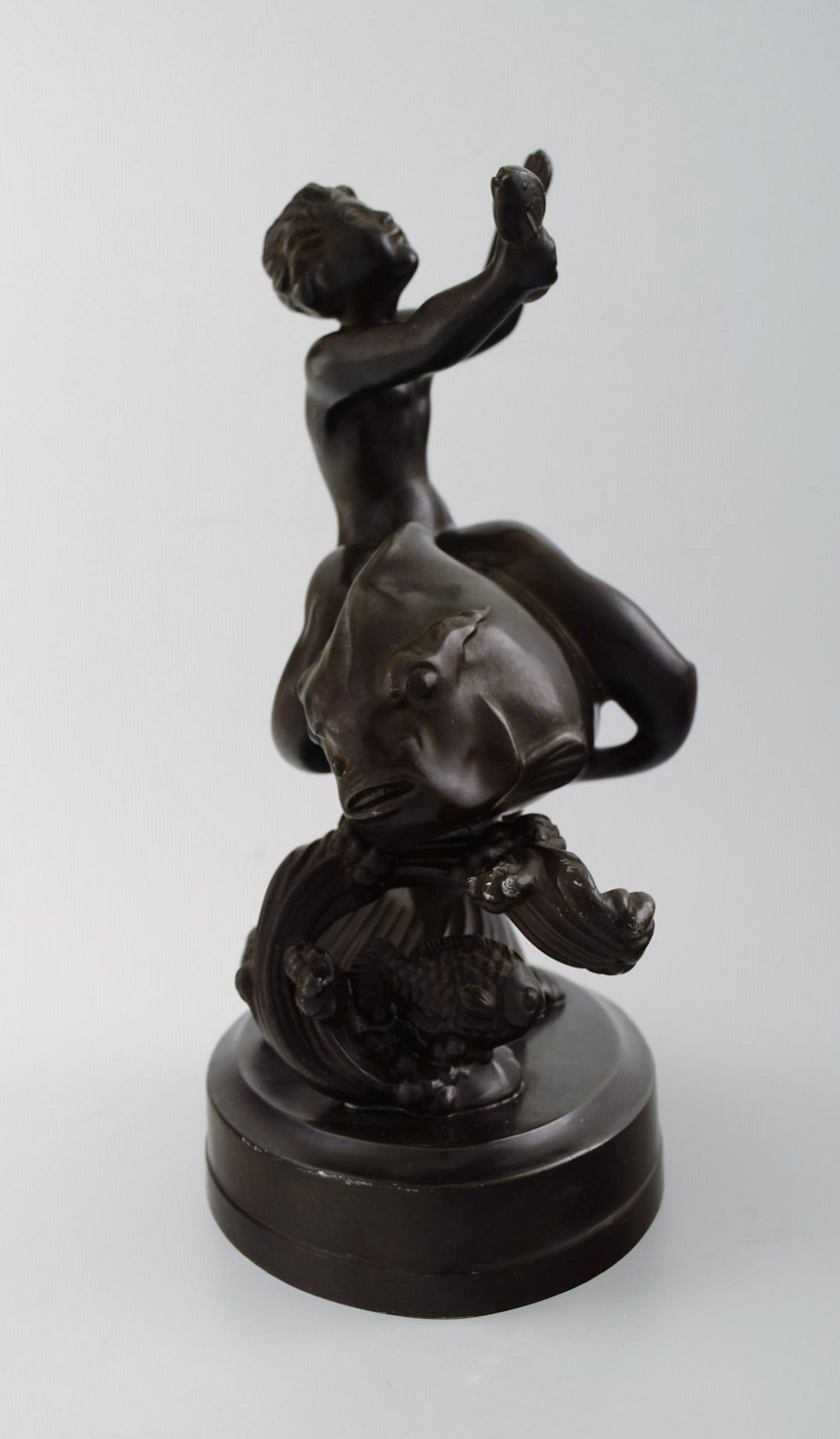 Just Andersen (1884-1943). Figur i disko metal i form af havdreng på fisk. 1930/40´erne.