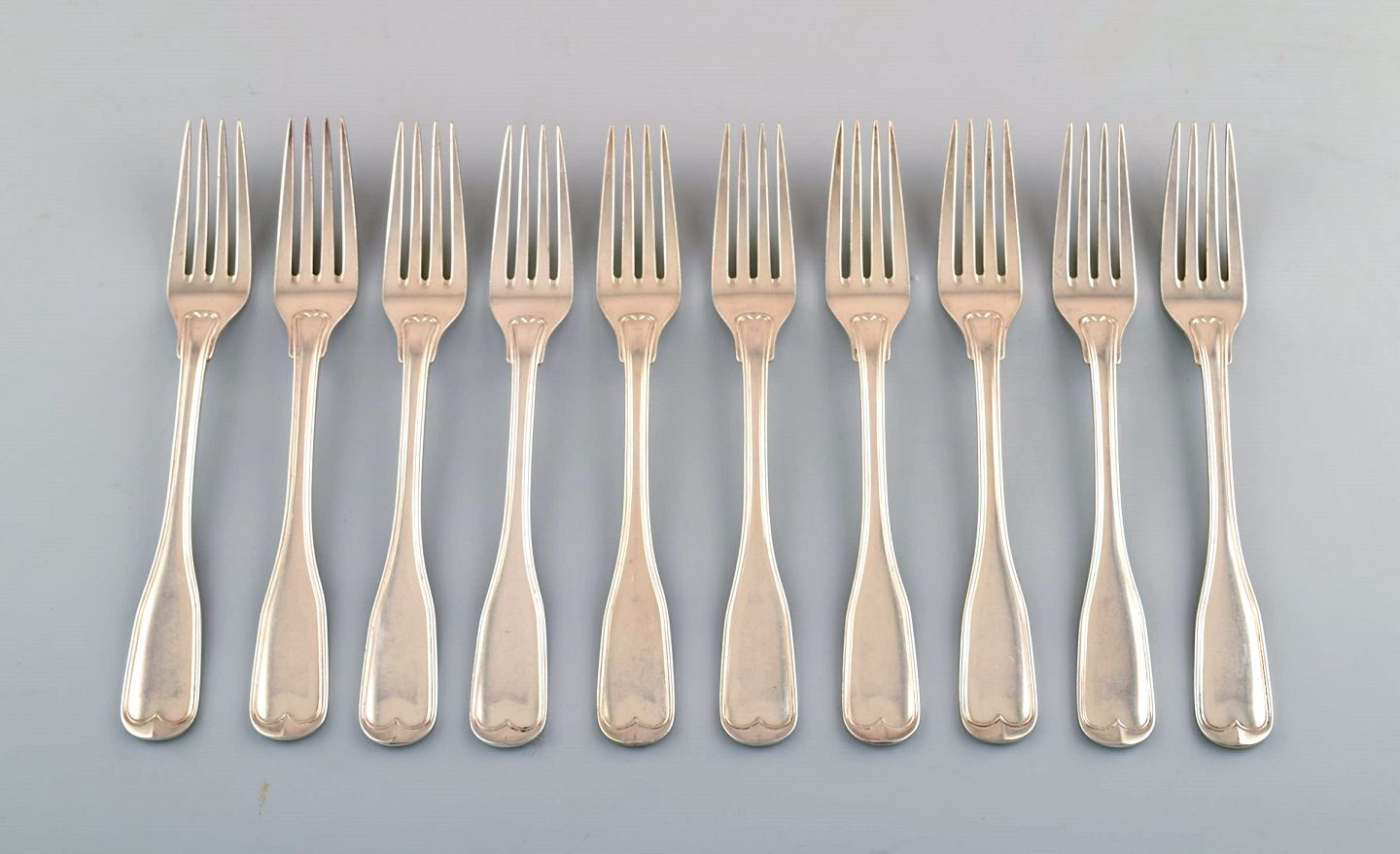 10 middagsgafler, gammel riflet, tretårnet sølv. Guardein : Jens Sigsgaard. Måler : 18 cm. I flot stand. Stemplet.