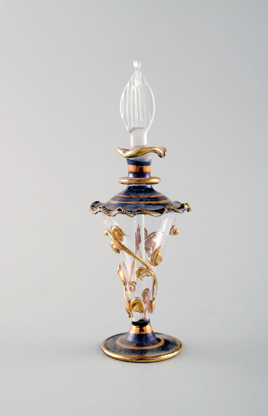 Stor samling af italienske flakoner i mundblæst kunstglas. Delvist farvet glas dekoreret med bladguld. 1930/40'erne.