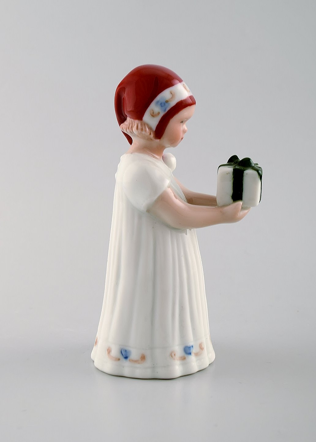 Sjælden Royal Copenhagen porcelænsfigur. Pige med nissehue og julegave. Modelnummer 091.