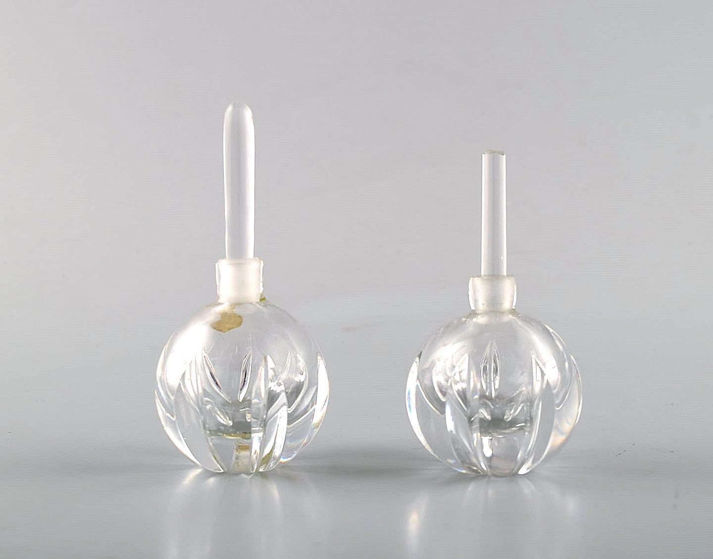Edward Hald for Orrefors. En samling på syv mundblæste art deco flakoner i klart og lyseblåt kunstglas. Designet i 1940'erne. I flot stand. Indridset signatur. Største måler: 10 x 6,5 cm.