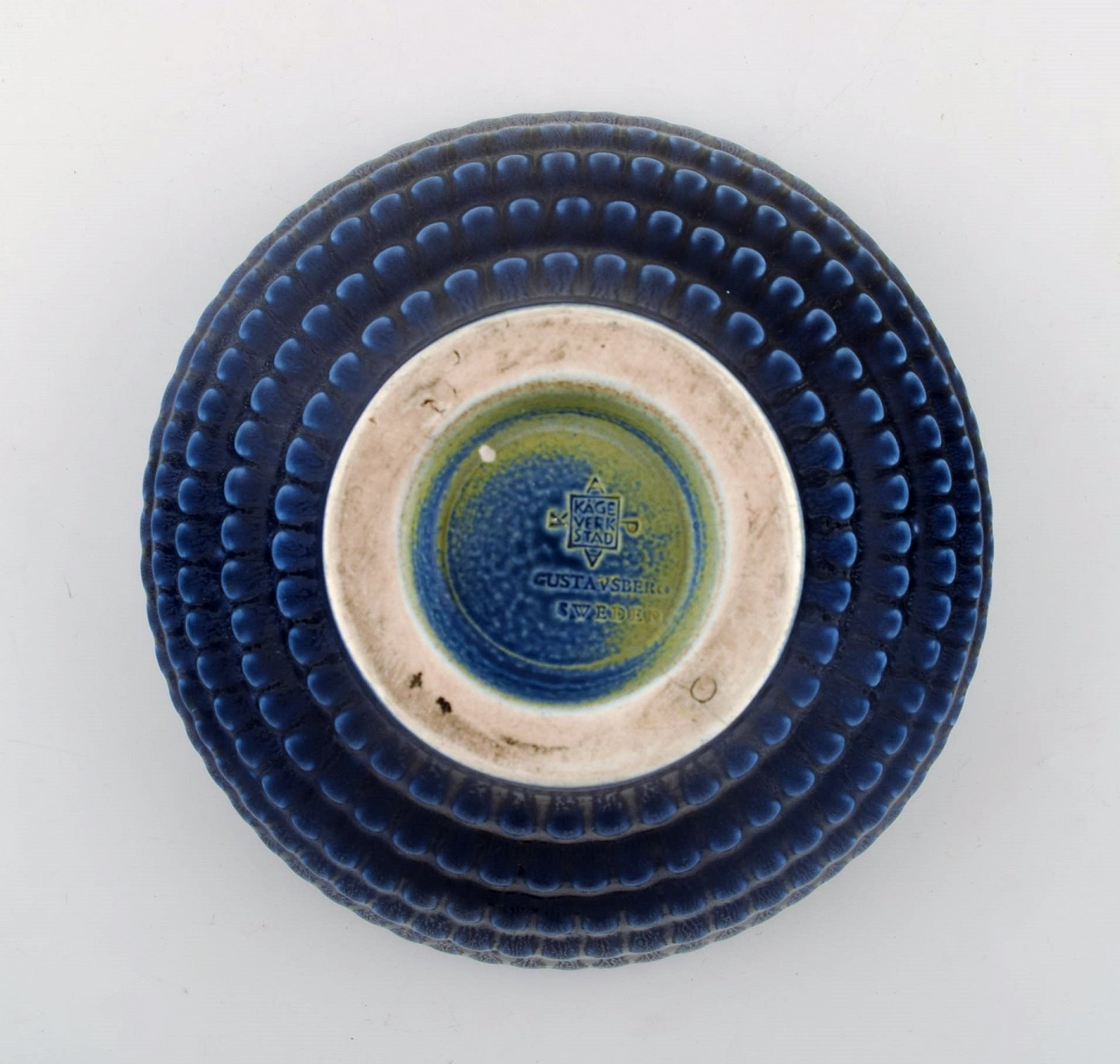 Wilhelm Kåge (1889-1960) for Gustavsberg. Stor skål af stentøj, dekoreret med blå/brun glasur. Stemplet. Gustavsberg Kåge Verkstad. I perfekt stand. Måler 20,5 cm x 10,5 cm.