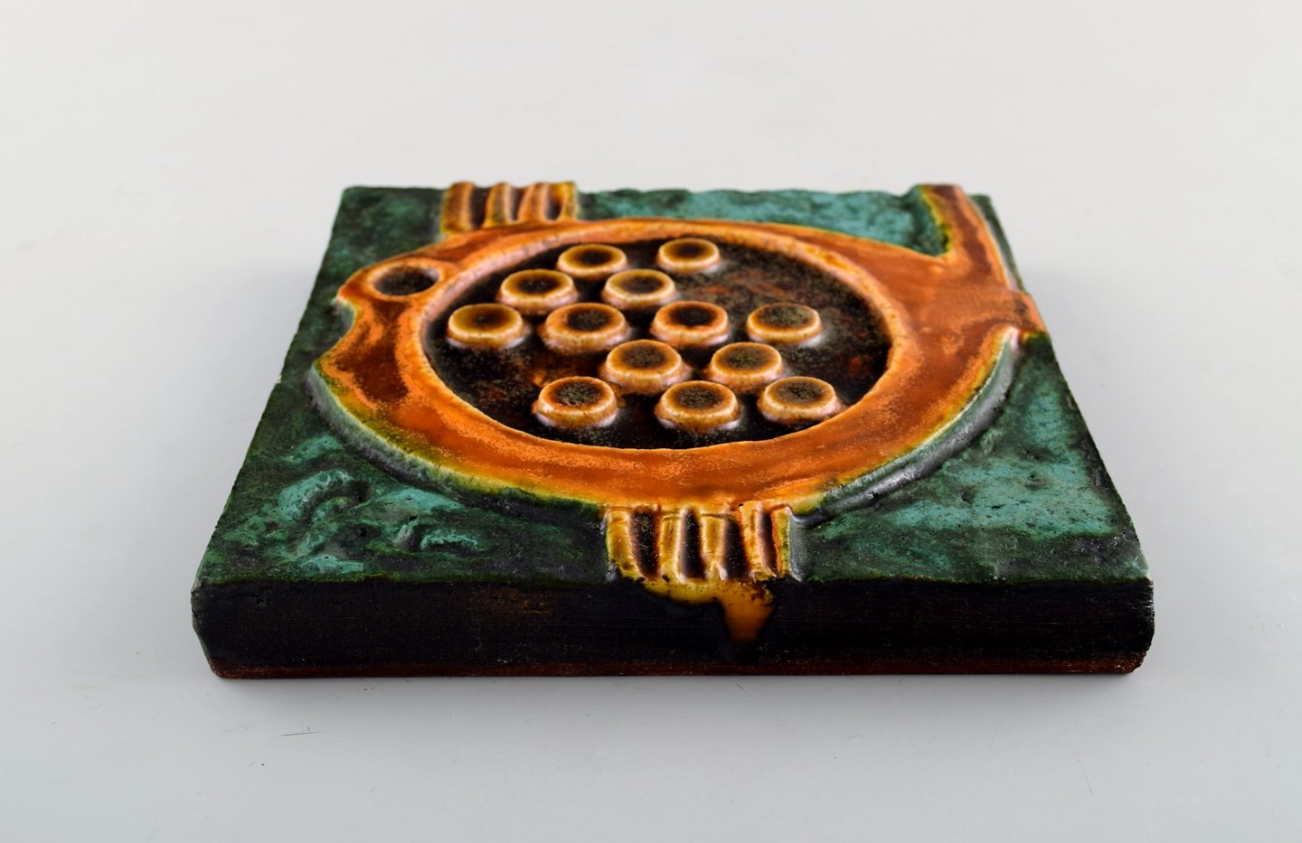Tysk keramik. Flise / relief i glaseret keramik med motiv af klumpfisk. 1960'erne.