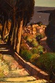 Robert Vernet-Bonfort (f. 1934), fransk kunstner. Olie på lærred. Cypresser i Beaulieu sur mer, den franske riviera. 1980'erne. Lærredet måler: 91 x 63 cm. Rammen måler: 7 cm. Signeret. I flot stand.
