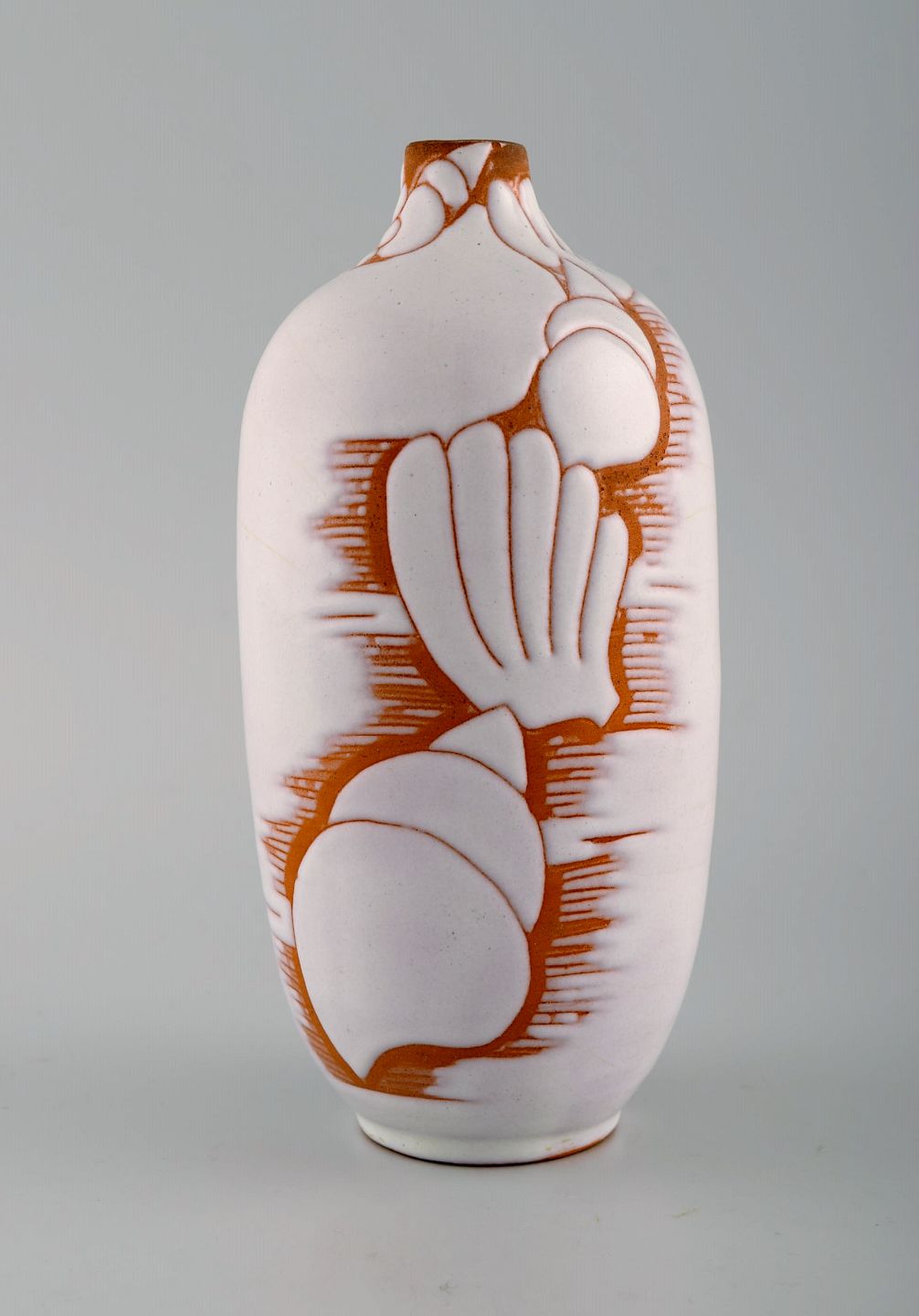 Anna Lisa Thomson (1905-1952), Sverige. Vase i hvidglaseret keramik med muslingeskaller og konkylie. Ca. 1950.