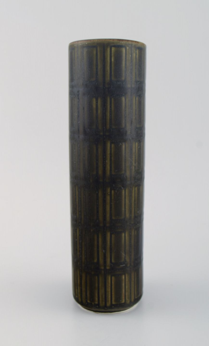 Arabia, finland. Vase i glaseret i keramik. Smuk glasur i mørkegrønne nuancer. 1960'erne. Måler: 24 x 8,3 cm. I flot stand. Stemplet.
