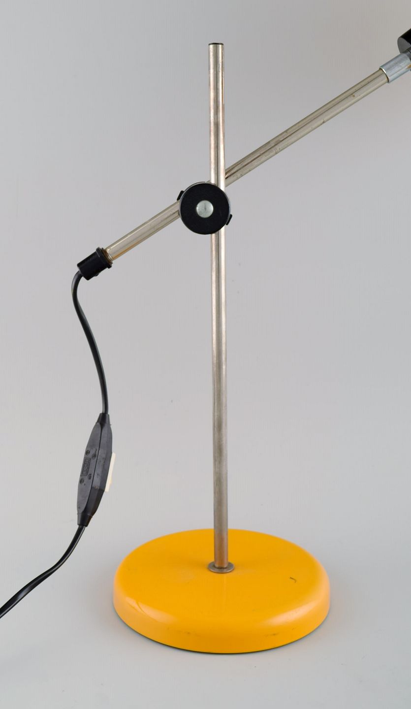 Svensk designer. Justerbar retro skrivebordslampe i gult lakeret metal og krom. 1970'erne. Fod diameter: 15 cm. Skærm diameter: 14,5 cm. Fuld længde: 71 cm. I flot stand.