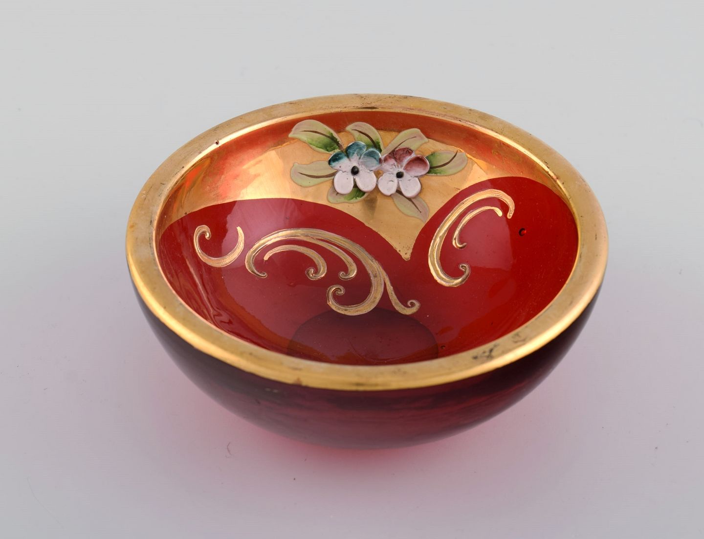 Skål i rødt mundblæst kunstglas med håndmalede blomster og gulddekoration. 1930/40'erne. Måler: 12,5 x 5 cm. I flot stand.