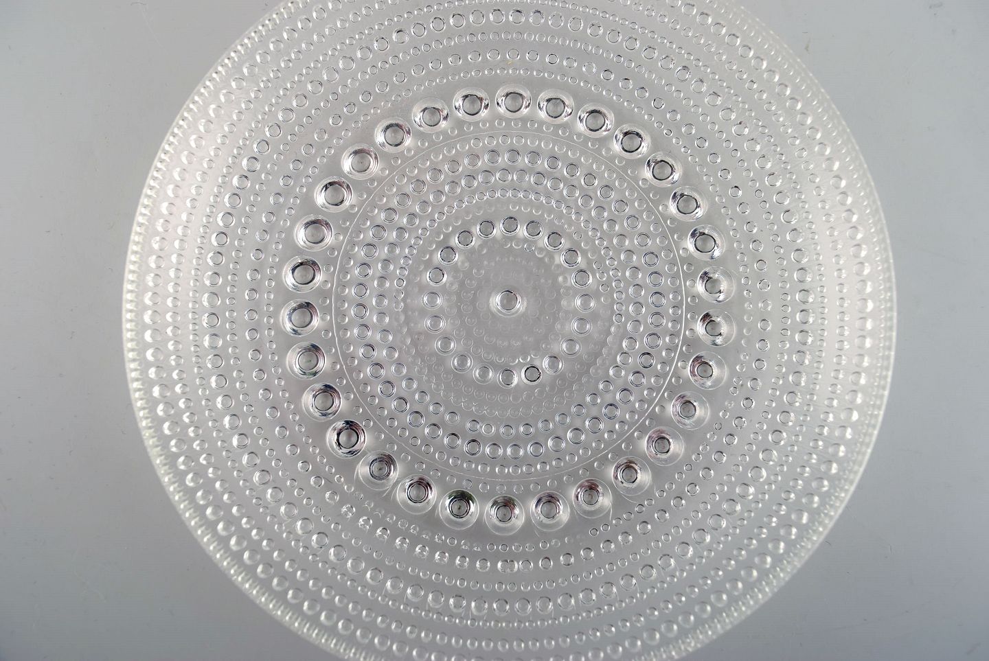Oiva Toikka for Arabia. Fem Kastehelmi tallerkener i klart kunstglas. Finsk design, 1970'erne. Diameter: 14 cm. I flot stand.