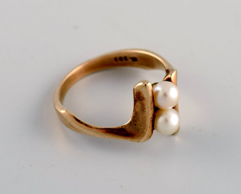 Dansk guldsmed. Modernistisk vintage ring i 8 karat guld prydet med to kulturperler. Midt 1900-tallet.