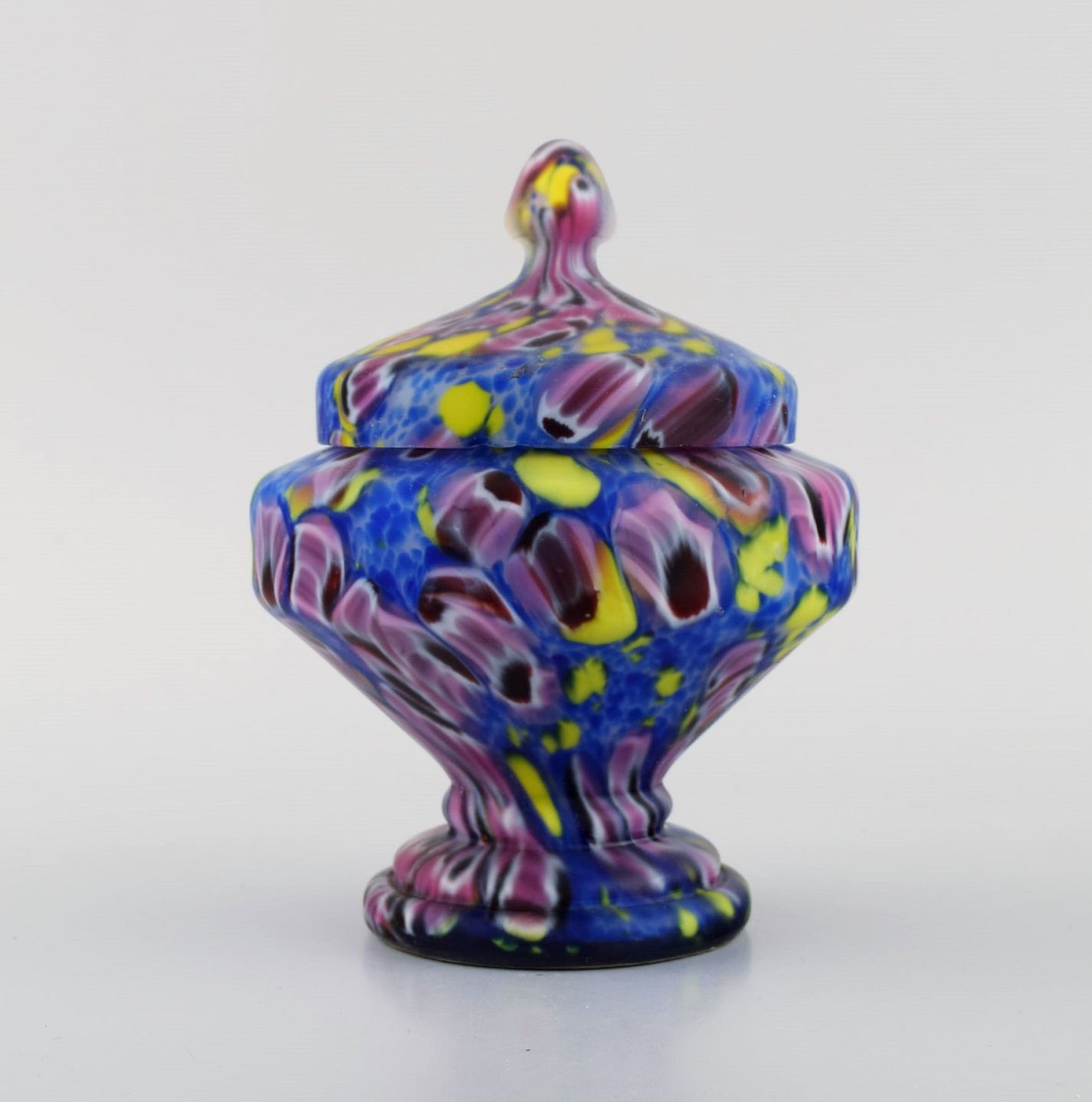 Art deco lågkrukke i polykromt mundblæst kunstglas på metalbund. Italiensk stil, 1930/40'erne. Måler: 15 x 12 cm. I flot stand. Lille revne fra produktionen.