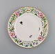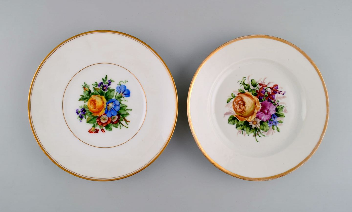 Fem antikke Royal Copenhagen tallerkener i porcelæn med håndmalede blomster, insekter og guldkant. Sent 1800-tallet. Diameter: 19,7 cm. I flot stand. Stemplet. 1. Sortering.