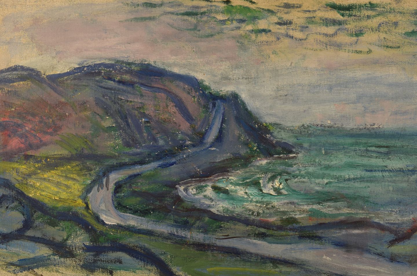 Pär Lindblad (1907-1981), Sverige. Olie på lærred. Modernistisk landskab. Mand på cykel langs kysten. 1940'erne. Lærredet måler: 64 x 31 cm. Rammen måler: 4,5 cm. I flot stand. Signeret.
