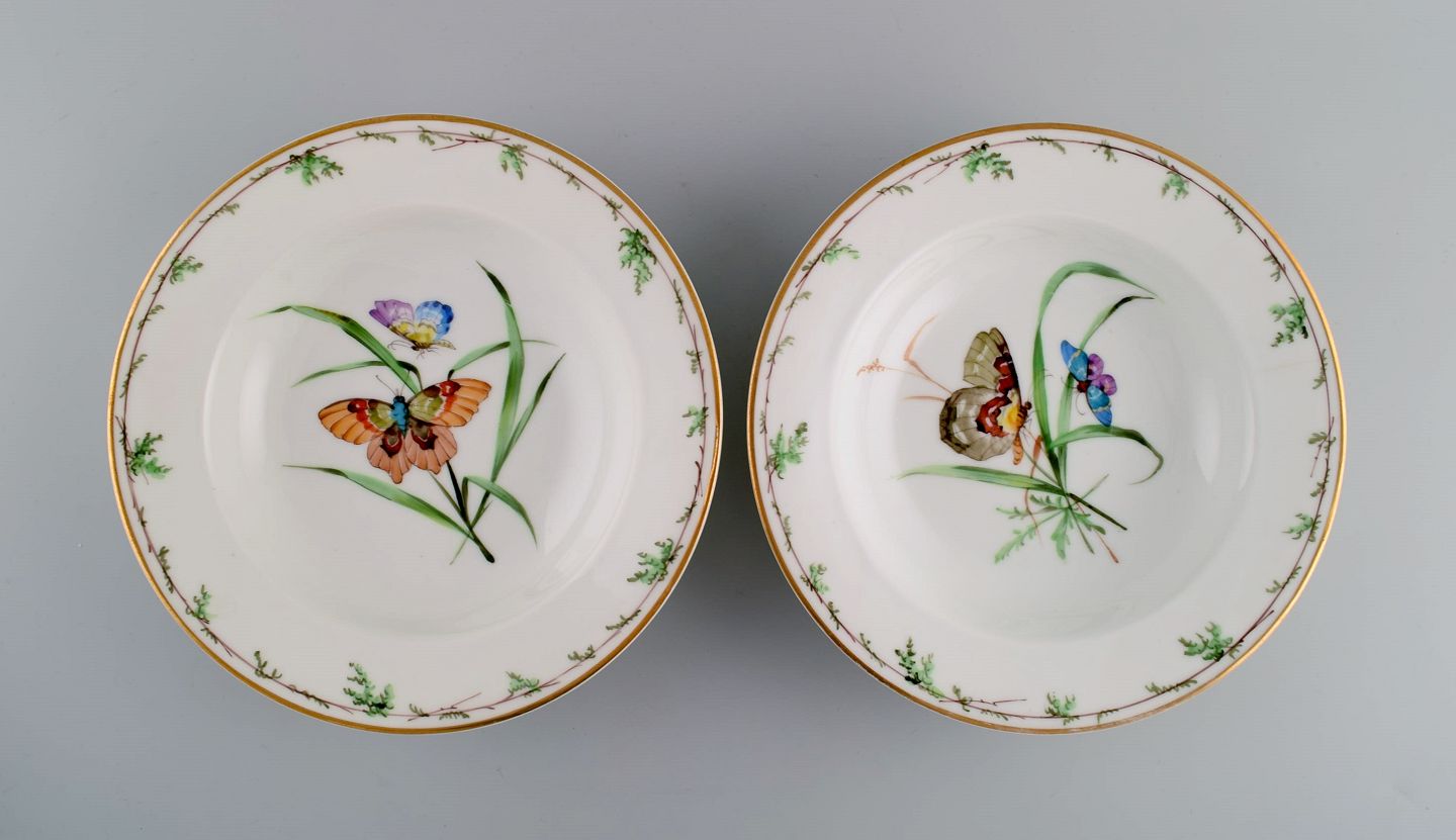 Fem antikke Royal Copenhagen dybe tallerkener i porcelæn med håndmalede blomster, sommerfugle og guldkant. Midt 1800-tallet. Måler: 23,3 x 5 cm. I flot stand. Stemplet.