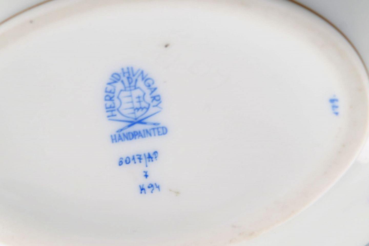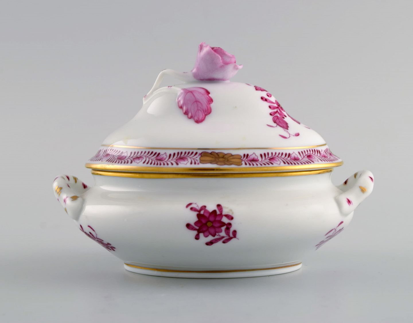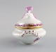 Herend lågskrin i porcelæn med håndmalede lilla blomster og gulddekoration. Låg modeleret med rosenknop. Midt 1900-tallet. Måler: 14 x 9,5 cm. I flot stand. Stemplet.