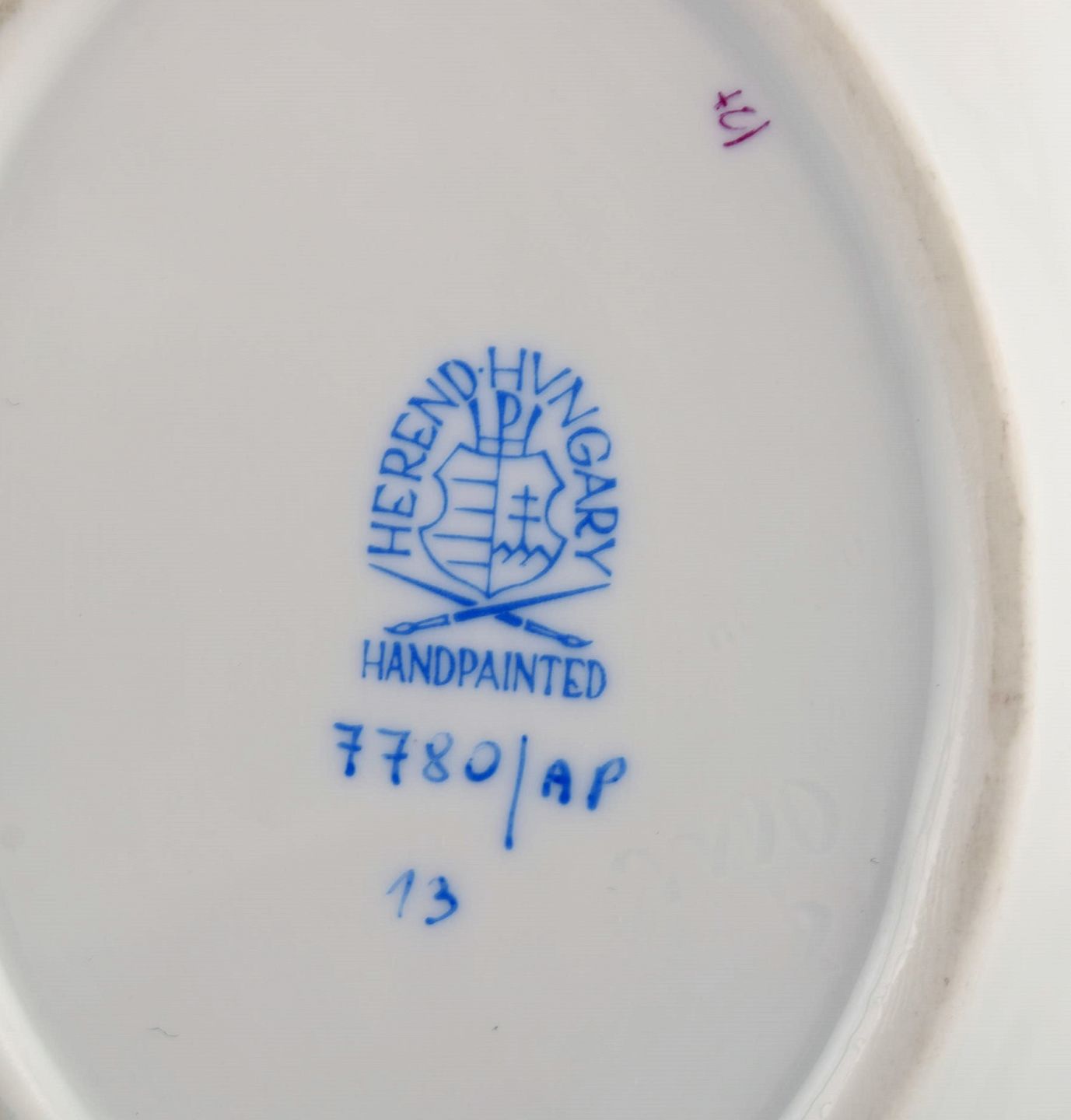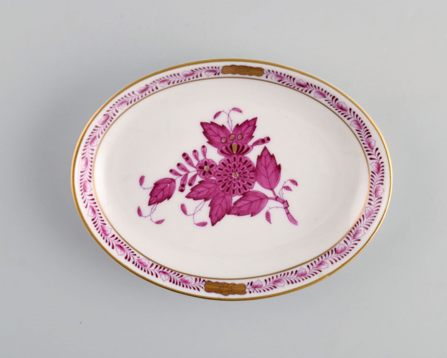 Fem små Herend porcelænsskåle med håndmalede lilla blomster og gulddekoration. Midt 1900-tallet.