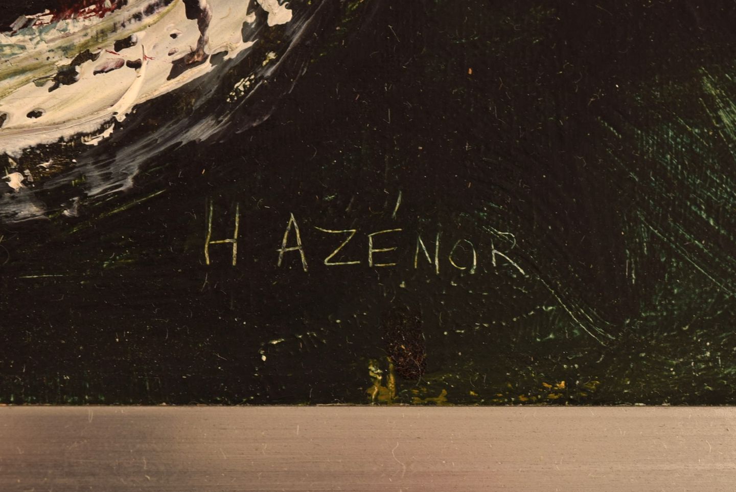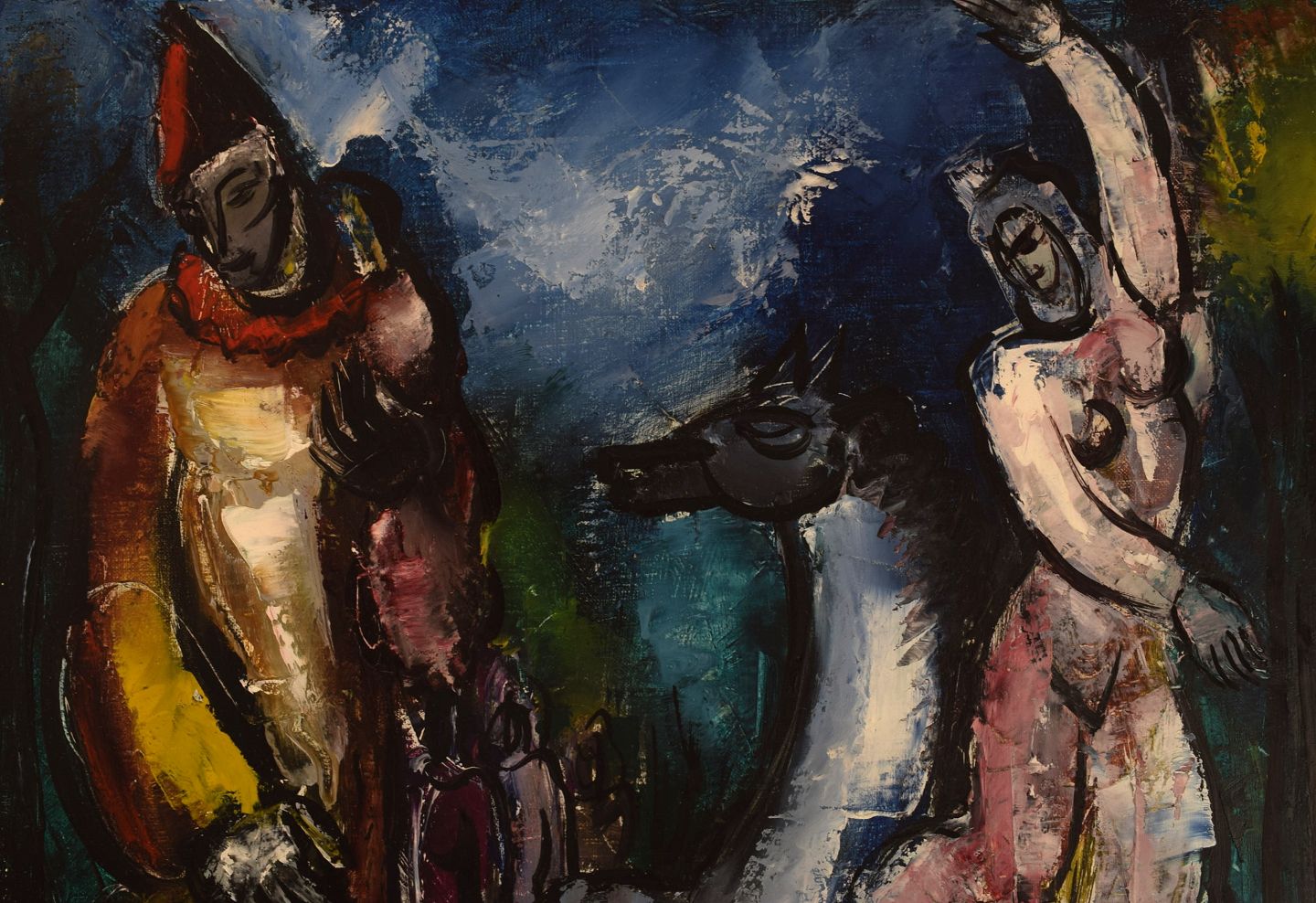 Hélène Azenor (1910-1999), fransk kunstner. Olie på lærred. Abstrakt cirkusscene. 1970'erne.