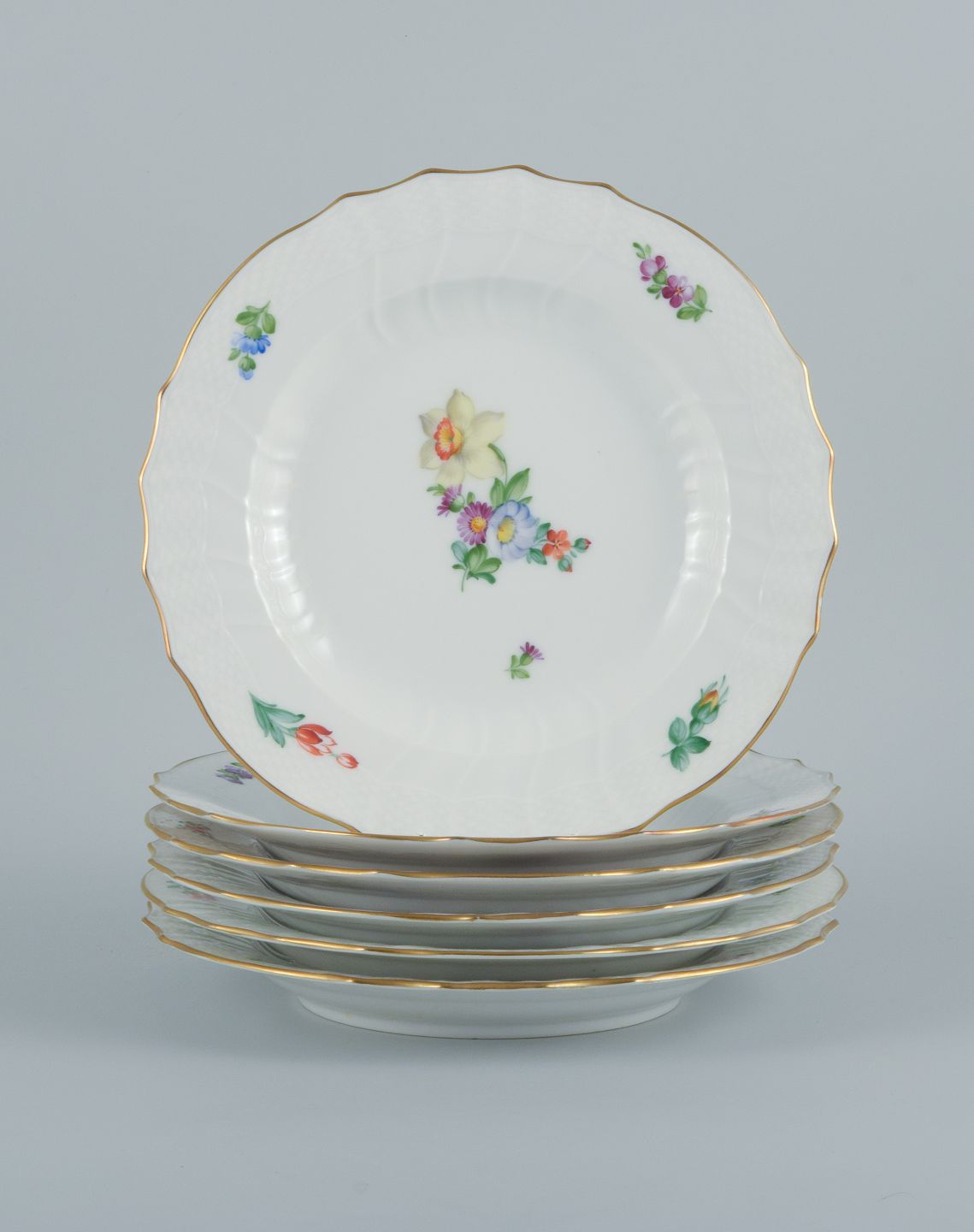 Royal Copenhagen Saksisk Blomst. Seks middagstallerkener i håndmalet porcelæn med blomster og gulddekoration.