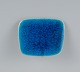 Fire unika brocher i glaseret stentøj i blå og gule nuancer med tilhørende sikkerhedsnåle.