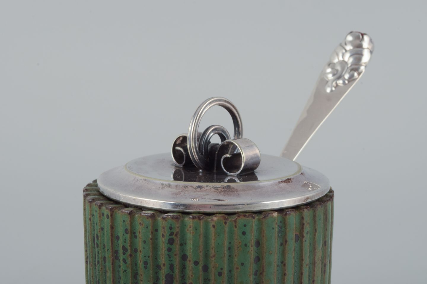 Med tilhørende låg af Hugo Grön i nysølv i art deco stil samt dansk tretårnet (830 sølv) marmeladeske.