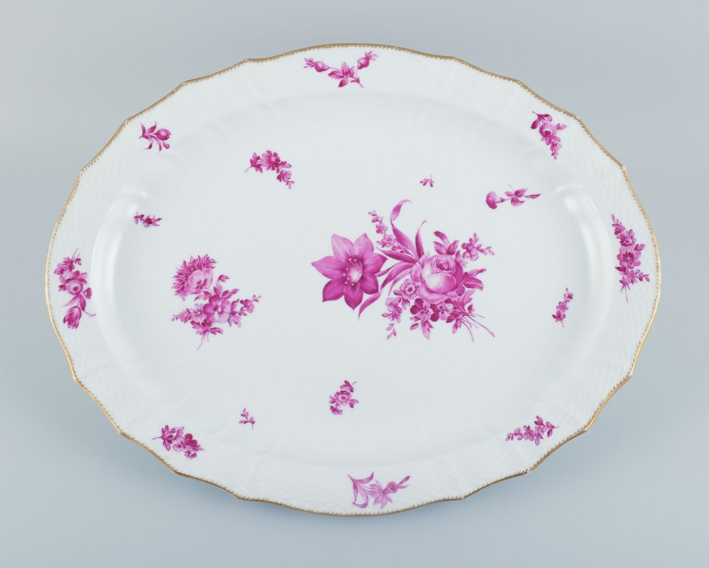 Royal Copenhagen, stort ovalt serveringsfad håndmalet med purpur blomster og guldkant.