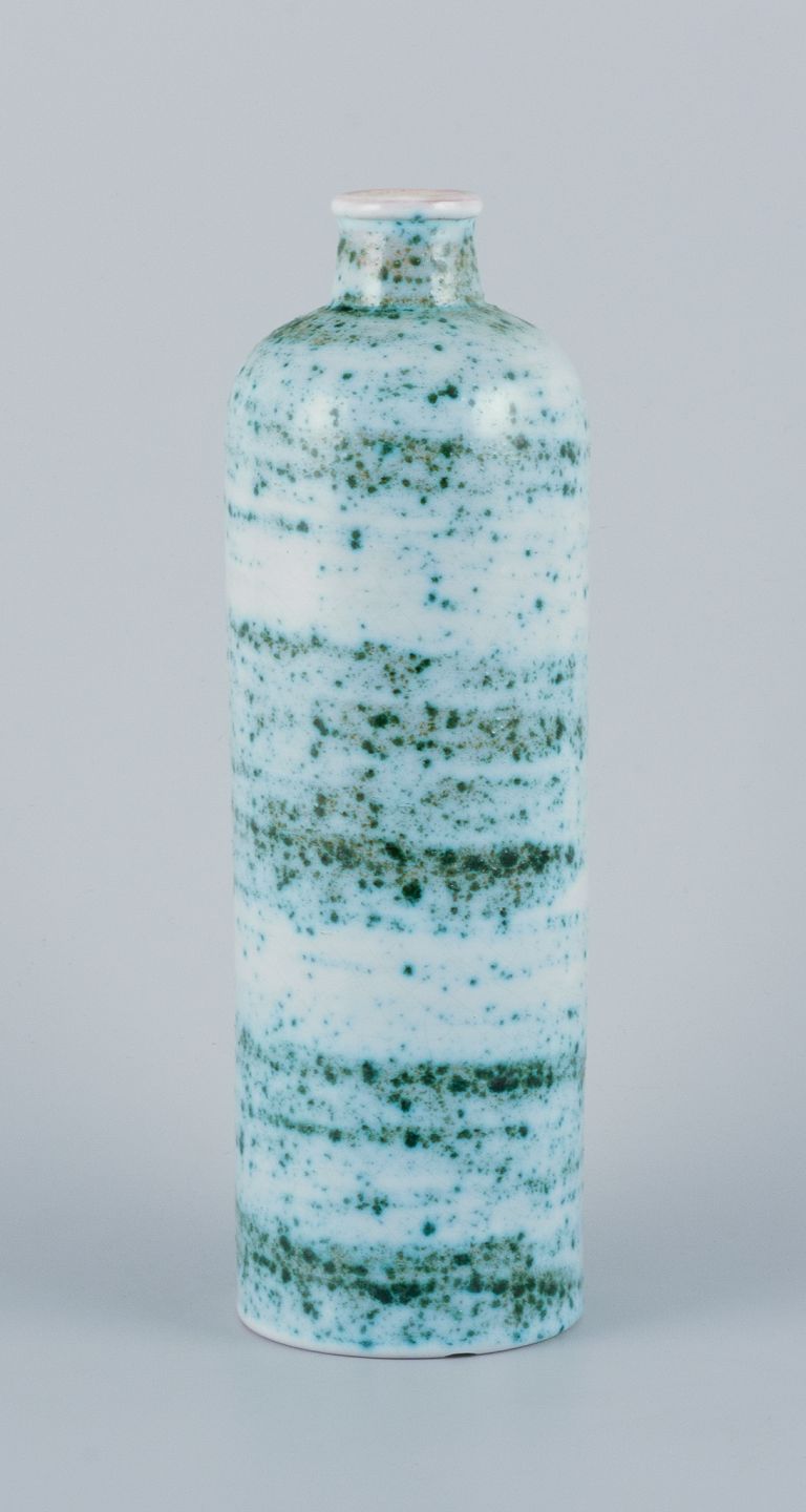 Nittsjö, Sverige, keramikvase, glasur i grønne nuancer på hvid bund. Sjælden model. 1960’erne. Perfekt stand. Stemplet. Mål: H 23,3 cm. x D 7,5 cm.