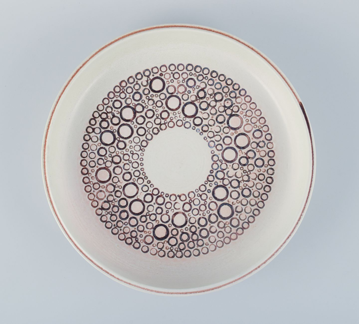 Britt-Louise Sundell (1928-2011) for Gusatvsberg, stor keramikskål i modernistisk design. Cirkler i brun glasur på cremefarvet bund.
