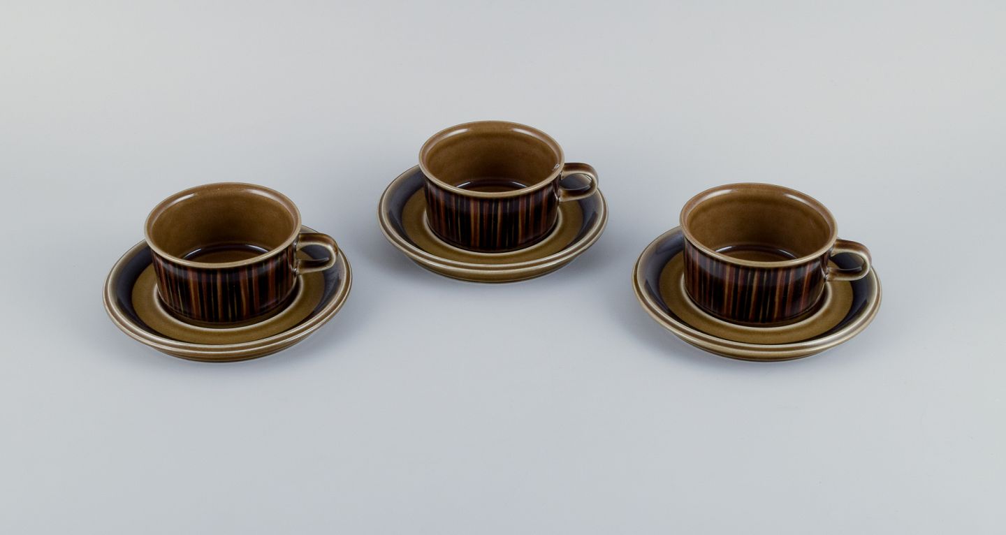 Gunvor Olin-Grönqvist for Arabia. ”Cosmos”, tre par tekopper med tilhørende underkopper. Stentøj i retrostil. Glasur i grønbrune toner.