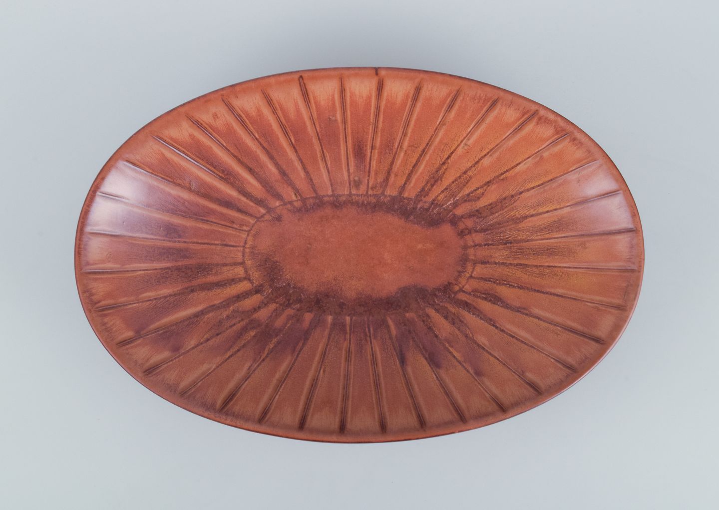 Stor oval keramikskål med glasur i brun harepelsglasur.