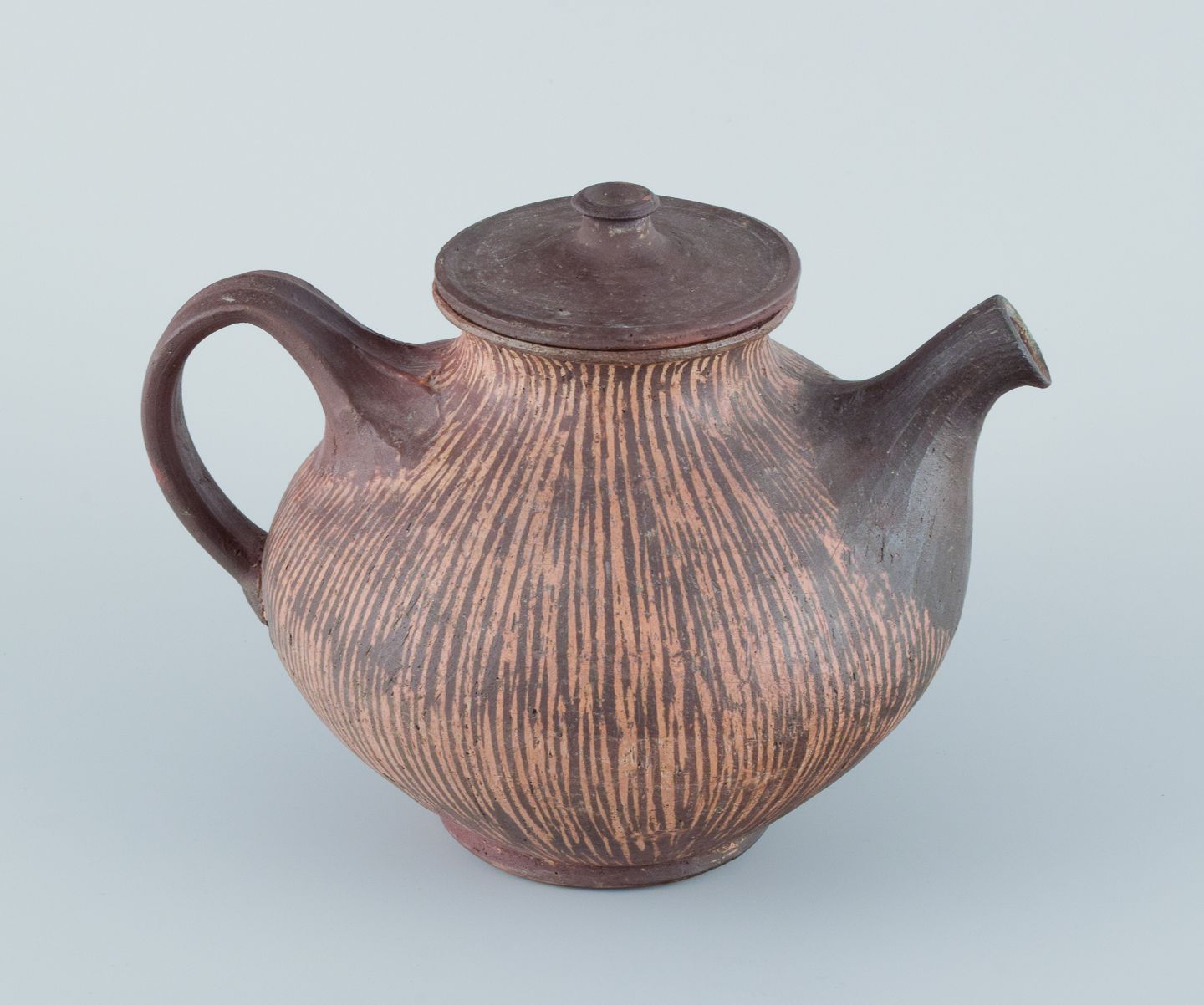 Gutte Eriksen (1918-2008), eget værksted, Danmark. Unika tekande i keramik. Raku-brændt. Glasur i brune og gule nuancer.
