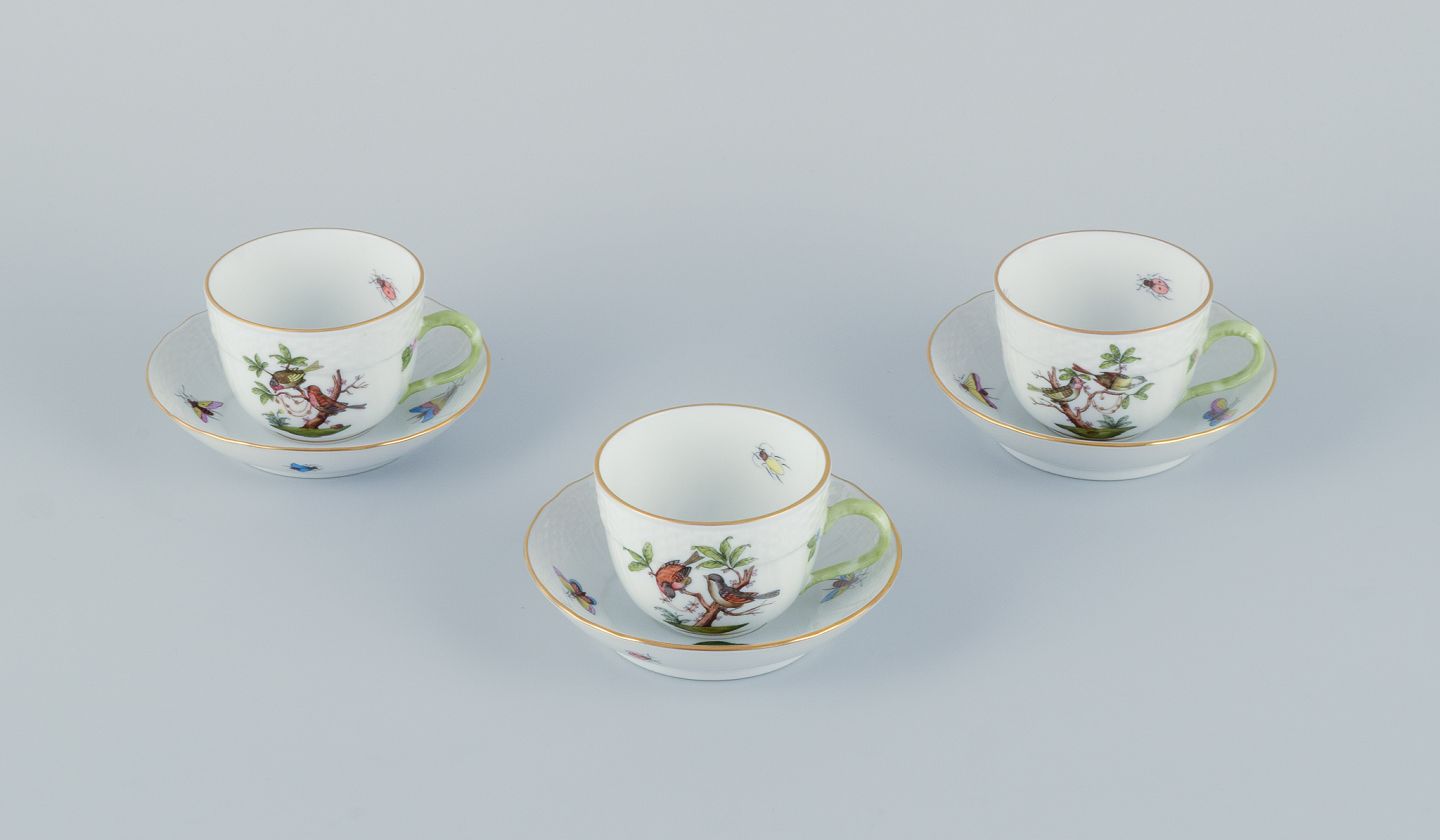 Herend, Ungarn. Tre kaffekopper med underkopper i porcelæn håndmalet med sommerfugle og fugle på gren. Guldkant.