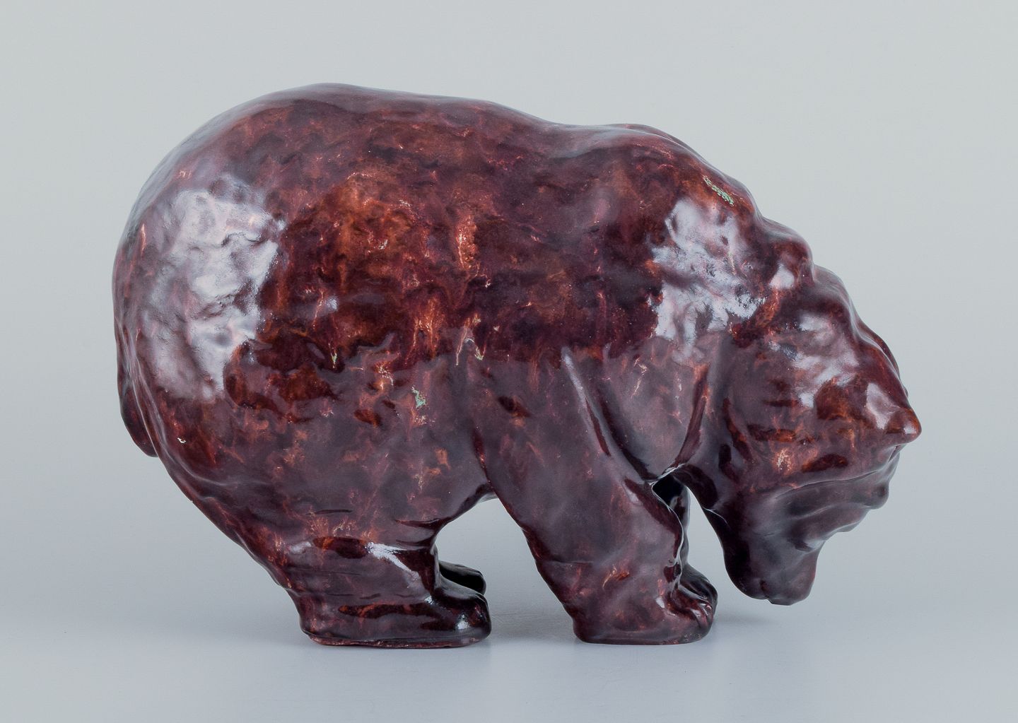 Dansk keramiker. Stor unika bjørn i keramik. Glasur i rødbrune nuancer. Signeret og dateret 1970. Perfekt stand. Mål: L 29,0 cm. x B 13,0 cm. x H 20,5 cm.