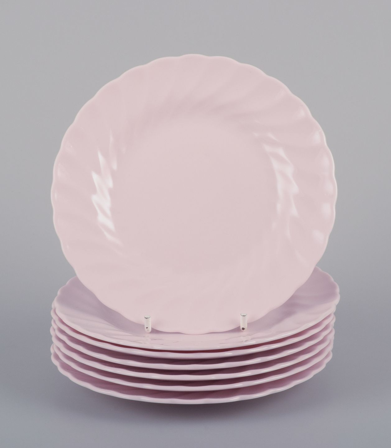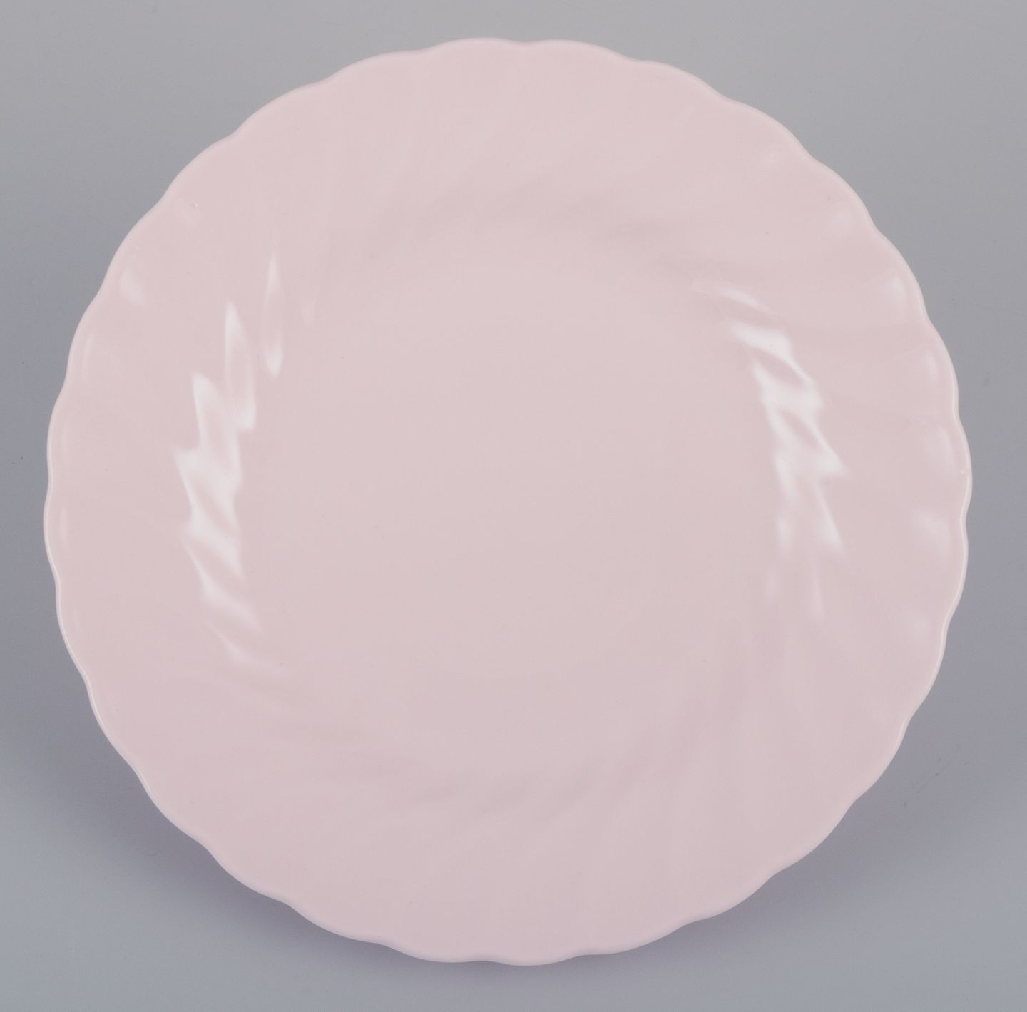 Tuscan, England, syv tallerkner i lyserødt porcelæn med bølget kant. Fine English bone China. Ca. 1930/40’erne. Perfekt stand. Stemplet. Mål: D 15,0 cm.