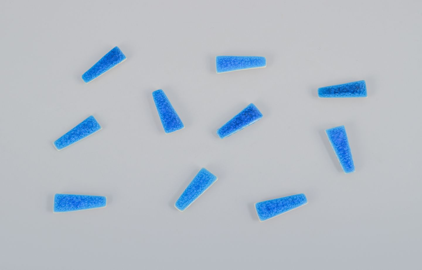 Ti unika brocher i glaseret stentøj i blå nuancer.