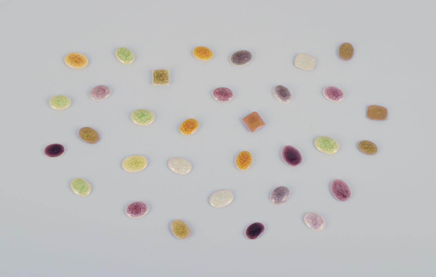32 unique brooches in glazed stoneware in purple, white, yellow, and green shades.