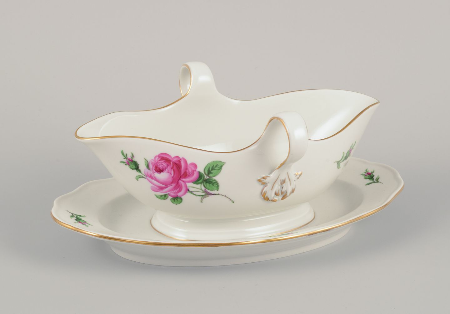 Meissen, Germany. Sauce boat on a stand with a motif of a pink rose. Gold rim.